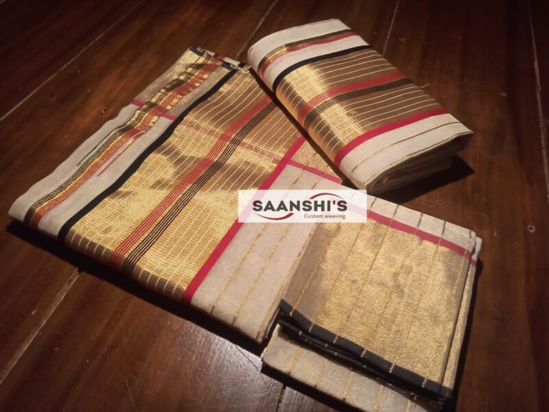 This is a premium set mund with a 2.8-metre length of mel mund, which gives it enough length to wear and is carefully woven by our master weavers of Kerala.