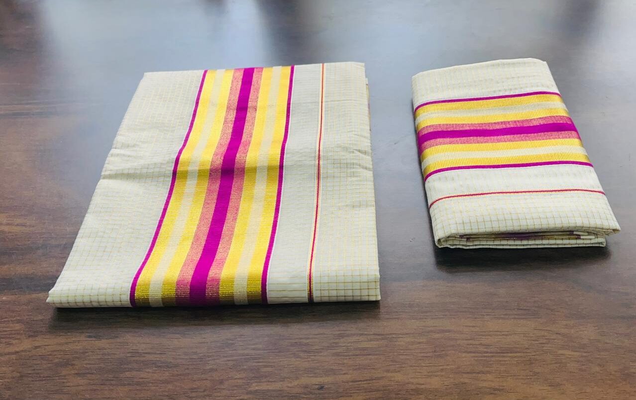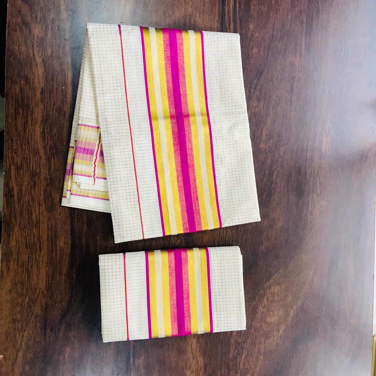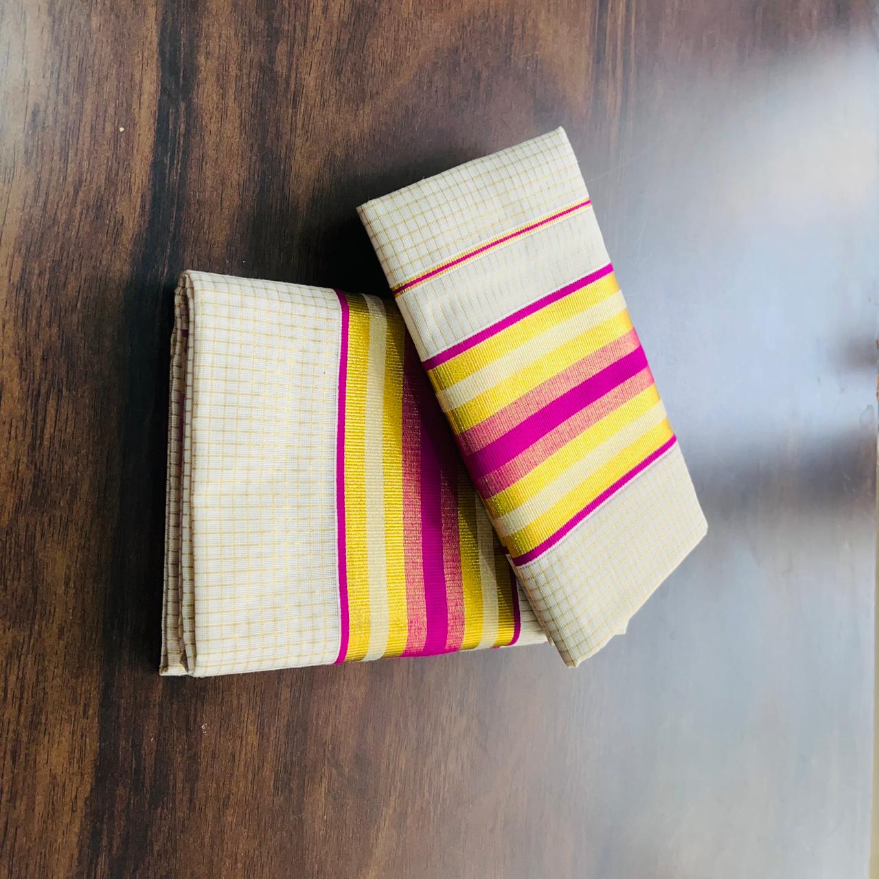 VY SET MUND-30219 | Off White Set Mund with Magenta Pink and Golden Kasavu Stripe Border