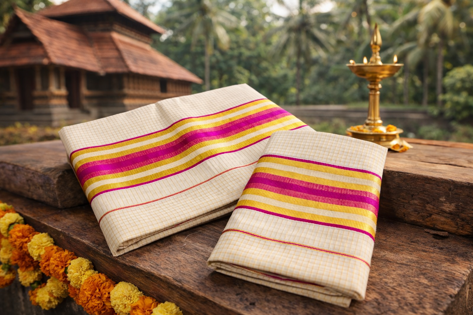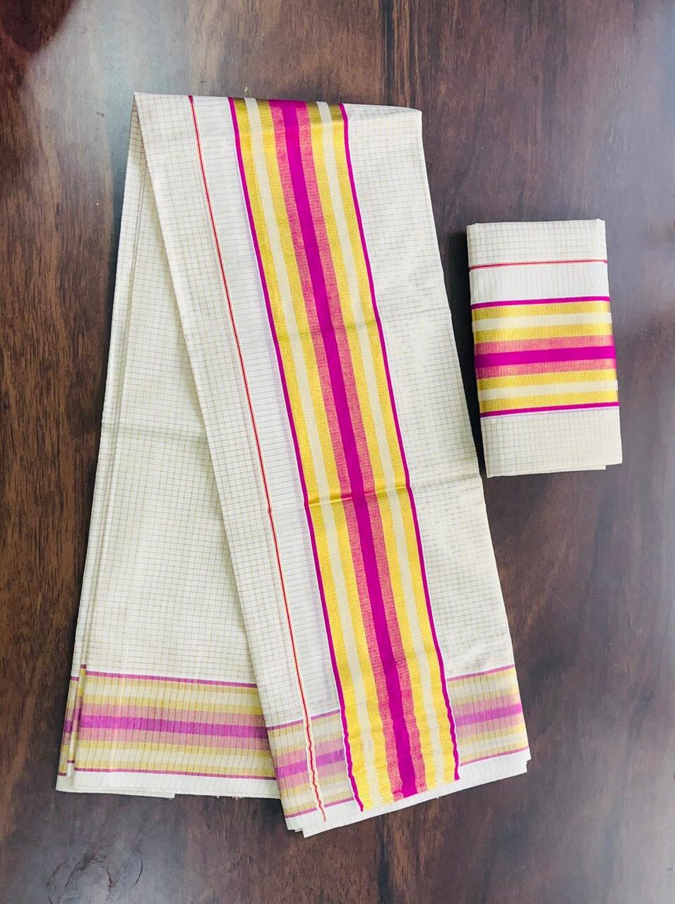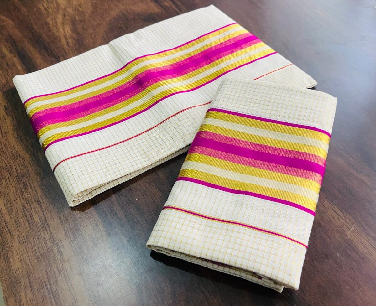 VY SET MUND-30219 | Off White Set Mund with Magenta Pink and Golden Kasavu Stripe Border