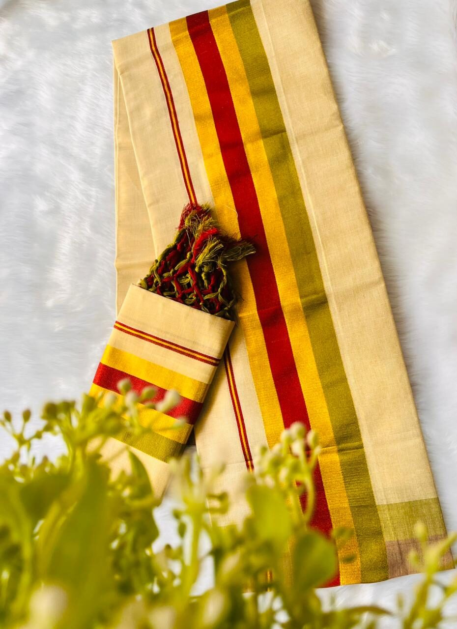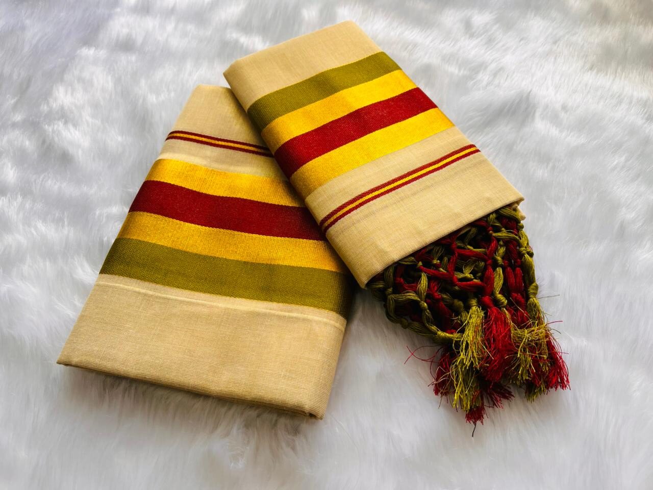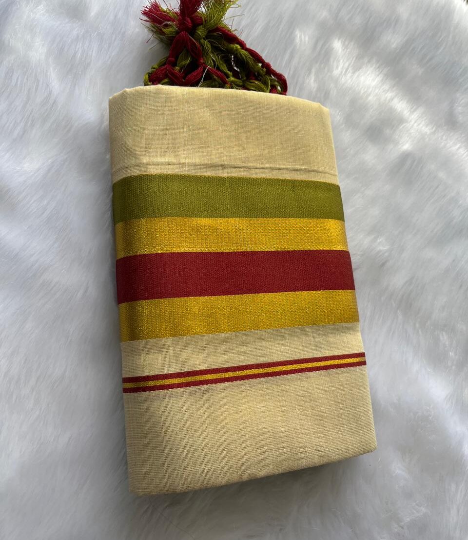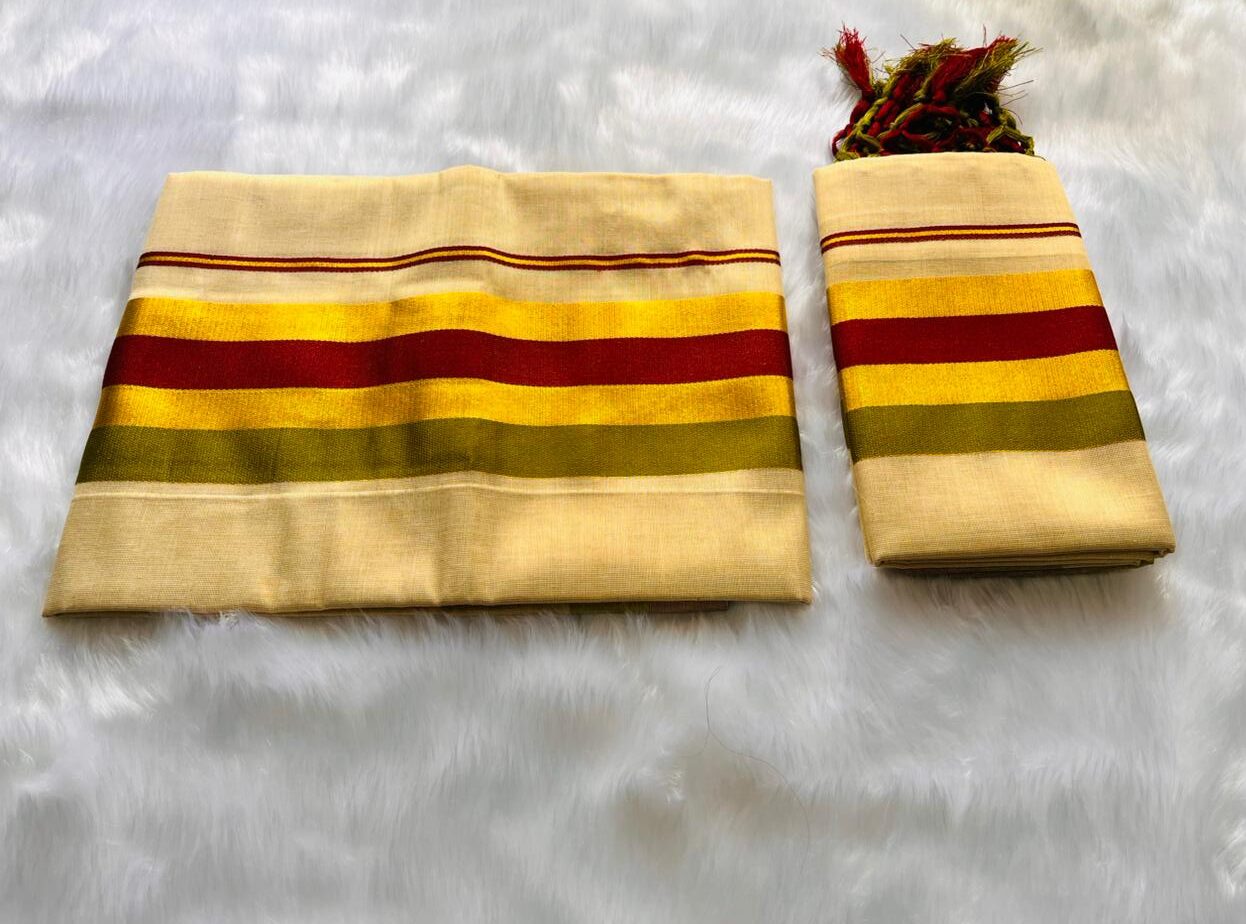 VY SET MUND-30223 | Cream Mundu with Golden Kasavu | Olive Green and Maroon Border